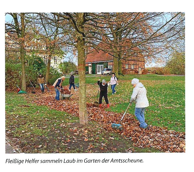 So ist das im November. Die Blätter haben der Schwerkraft nichts mehr entgegenzusetzen. Da lagen sie nun, verwelkt und nichts mehr von ihrem Grün war übriggeblieben. Wir waren uns einig. Die müssen weg. Bewaffnet mit Harke, Schaufel und Gebläse machten die Mitglieder des Amtsscheunen-Ausschusses sich an die arbeit und luden über den Daumen geschätzt 85,2% der Blätter auf einen Hänger.